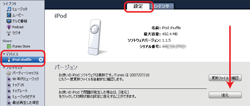 iTunesがiPod shuffleを認識するとiTunesの左側にデバイス=iPod shuffleが表示されます。